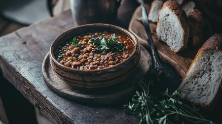 This image showcases a warm bowl of hearty bean stew topped with fresh herbs, accompanied by crusty bread on a rustic wooden table, evoking comfort.
