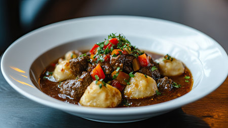 A hearty beef stew served with fluffy dumplings in a white bowl. This comforting dish features tender meat and fresh herbs, perfect for any meal.