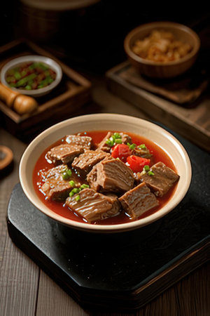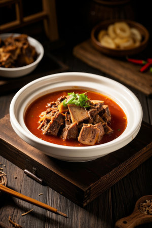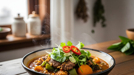 A steaming bowl of hearty beef stew or curry, garnished with fresh cilantro and sliced red chilies. The dish is served in a ceramic bowl on a wooden table, highlighting its rich, spicy broth.