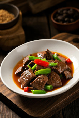 Braised beef in brown sauce with potatoes and green leaves on wooden table