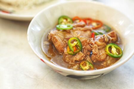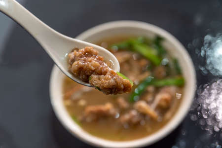Hot and sour meat soup (Tom Yum) pork or chicken for sale at Thai street food market or restaurant in Thailand
