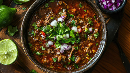 A delicious bowl of Mexican birria with rich broth and fresh garnishes, viewed from above.