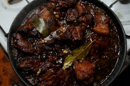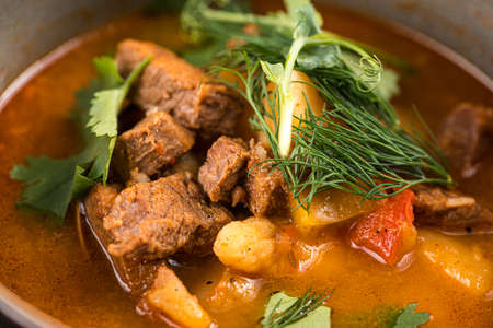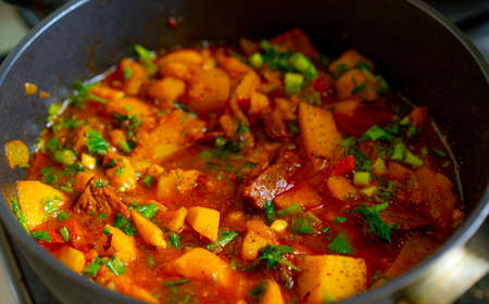 Georgian dish Chashushuli, spicy veal stewed in tomato gravy