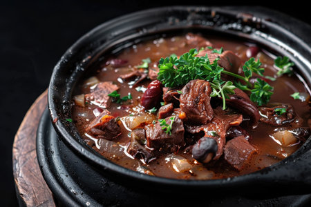 A close-up view of a hearty beef stew with red beans and parsley in a black pot.