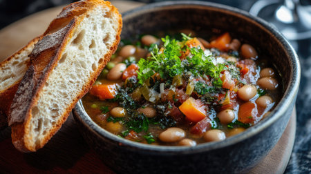 A rustic bowl of hearty bean soup garnished with fresh herbs, accompanied by a slice of crusty bread, perfect for a comforting meal.