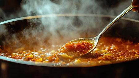 A macro view of a spoon stirring a pot of simmering sauce, showcasing the rich texture and steam rising from the hot mixture.