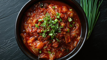 A vibrant bowl of fresh kimchi garnished with green onions, perfect for adding a spicy, savory kick to any meal. Enjoy this traditional Korean dish.