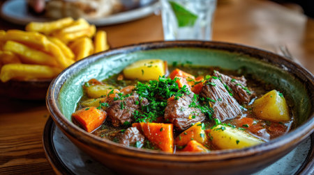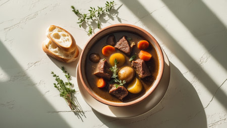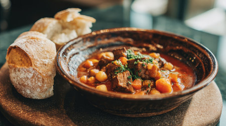 A warm bowl of hearty beef stew filled with tender chunks of meat and fresh vegetables, served alongside crusty bread, perfect for a comforting meal.