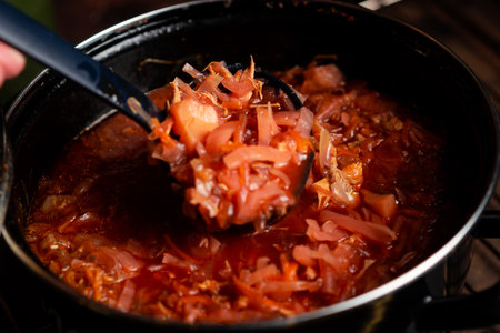 Saucepan with red Ukrainian borscht. The national dish is a soup of cabbage, beets and vegetables in meat broth.