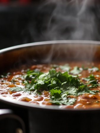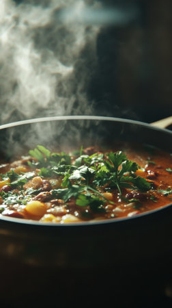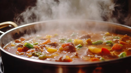 A close-up of a pot simmering with a hearty soup or stew, with steam rising and fresh herbs or vegetables visible, set against a cozy kitchen backdrop.