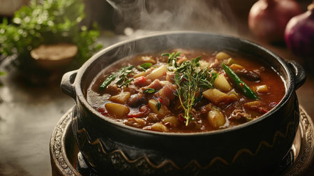 A close-up of a simmering stew, with steam rising from the pot and fragrant herbs visible on top, creating an inviting cooking scene.