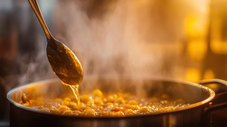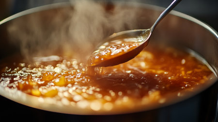 A captivating close-up shot featuring a spoon stirring a flavorful broth in a steel pot, with steam rising in a warm kitchen setting, evoking comfort and culinary enjoyment.