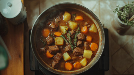 Hearty Beef Stew Simmering in a Pot, Rustic Comfort Food Photography for Culinary Blogs