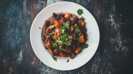 A vibrant and mouthwatering beef stew simmering in a pot, featuring tender meat, colorful vegetables, and aromatic herbs. Perfect for a cozy meal.