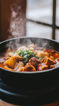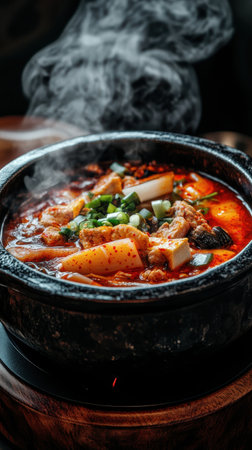 A vibrant hot pot filled with various ingredients simmering in a flavorful broth, creating a cozy and communal dining experience perfect for gatherings.