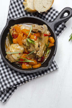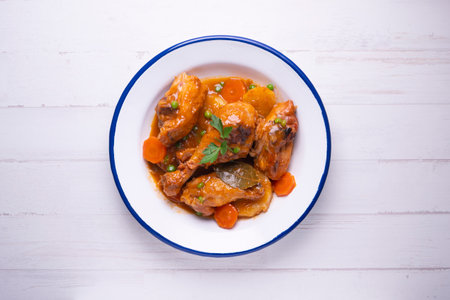 Homemade beer chicken stew with vegetables and aromatic herbs from above.Flat lay