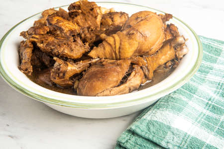 A serving of Filipino-style chicken adobo dish in a bowl with green napkin set on a marble tabletop.