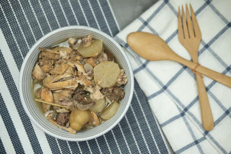 stew chicken with ginger and onion on wooden background