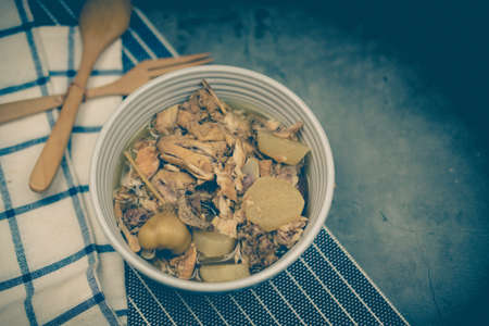 Delicious Taiwanese shiitake mushroom chicken soup in a bowl on white table background.
