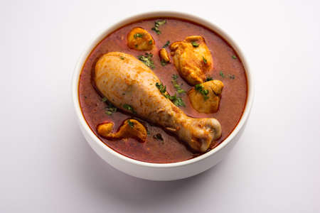 Indian spicy Chicken curry or masala chicken with prominent leg piece, popular recipe from India, selective focus