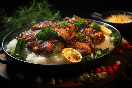 Rice ornament with spicy grilled grilled chicken thigh on a granite plate, generative AI