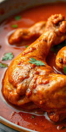 Experience the rich flavors of chicken thighs simmering in a spicy tomato sauce, infused with fresh herbs and garlic in a cast iron pan. Perfect for cooking enthusiasts.