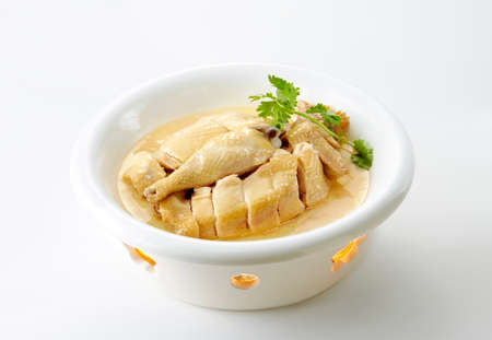 Boiled chicken fillet in sauce with parsley on white background
