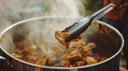 A vibrant scene of chicken being cooked in a large pot, exuding steam and savory aromas. Perfect for showcasing outdoor culinary experiences and gatherings.