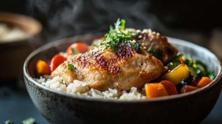 A beautifully presented bowl of roasted chicken surrounded by vibrant vegetables and herbs, perfect for a cozy dinner or gathering with loved ones.