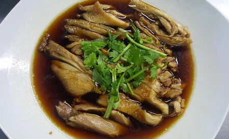 Close-up of Asian food style marinated steamed chicken (Betong Chickken) and sauce on ceramic plate. Serving chilled as an appetizer.