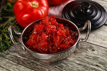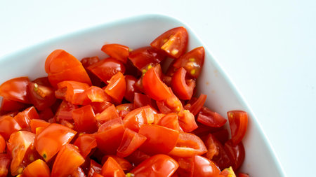 Diced ripe tomato with sauce in the bowl