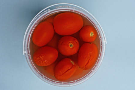 red canned tomatoes in a white open plastic bucket stands on a gray table
