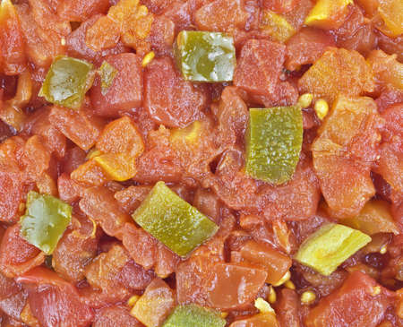A very close view of freshly diced tomatoes with green chilies