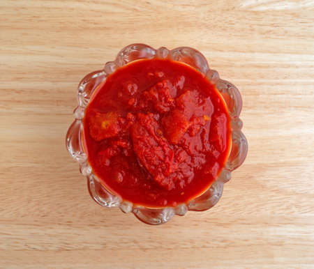 Top view of a bowl of crushed jalapeno peppers and tomatoes on a wood table top.