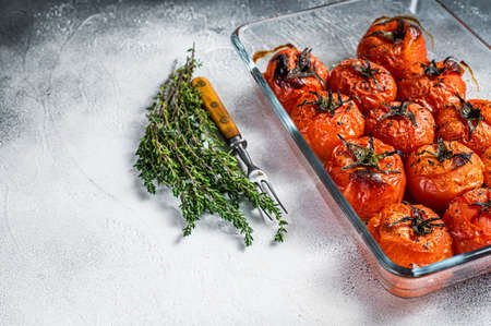 Baked cherry tomatoes with olive oil and thyme in baking dish. White background. Top view. Copy space