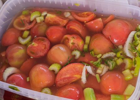Pickled tomatoes in plastic box in a street market.