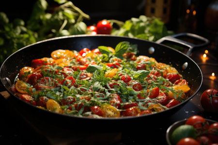 fried tomatoes with onions and parsley in a pan close-up. View from above.
