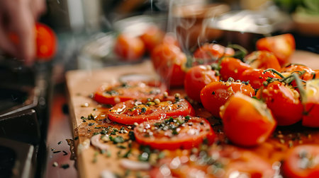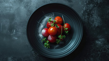 Plate with ripe tomatoes sprinkled with provencal herbs. Top view. Summer background.