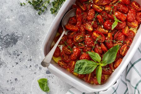 Baked cherry tomato with garlic, thyme and basil in old baking pan on concrete vintage background. Top view.