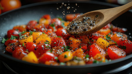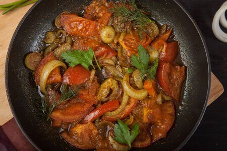 Tomatoes with pepper and onion are fried in a frying pan in oil. Horizontal photo.