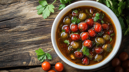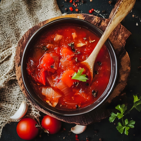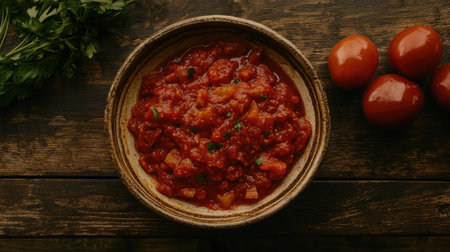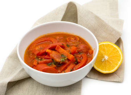top view of red lecho of tomatoes and pepper in the white bowl on the table. Hungarian food. copy space. flat lay