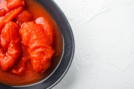 Whole canned tomatoe, on white background, top view flat lay with copy space for text