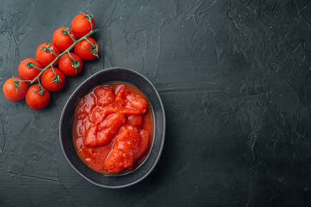 Whole canned tomatoe, on black wooden table background, top view flat lay with copy space for text
