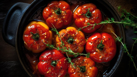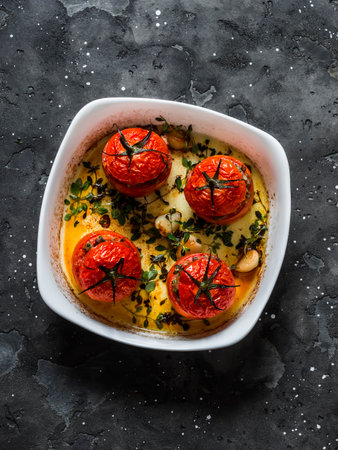 Stuffed meat roasted tomatoes on a dark background, top view