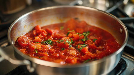 homemade tomato sauce with vegetables simmering on a stove top