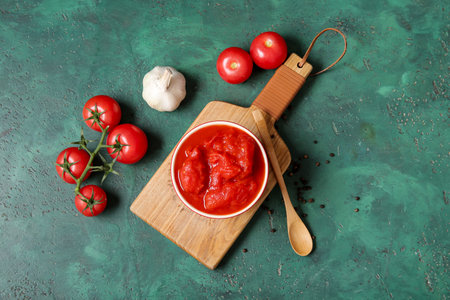 Wooden board with bowl of canned tomatoes and spices on color background