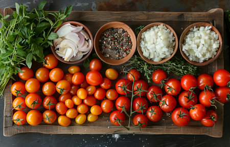 Tomato sauce with ingredients. Top view, flat lay with copy space