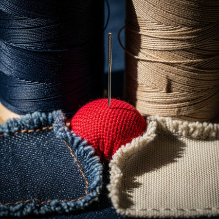 This close-up image showcases colorful threads and needles intricately arranged on a fabric surface, highlighting the art of stitching and craftsmanship. Perfect for creative projects.