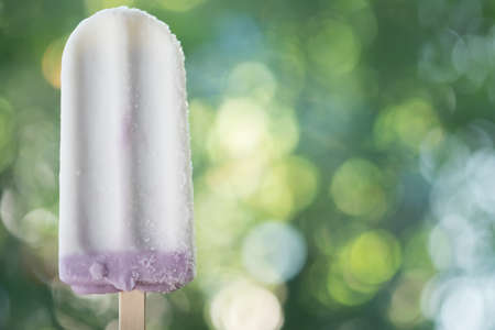 A taro ice cream on wooden stick with blurred green nature background