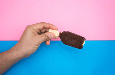 man holding a chocolate outer ice cream stick with couple of bites on blue background